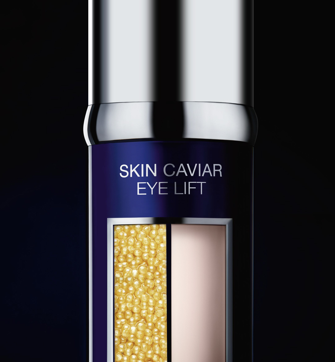 The innovation that defines Skin Caviar Eye Lift is not limited to its cutting-edge formula. With a press of the activating pump, the two formulas – one encapsulated in caviar beads, the other in an innovative tourmaline-pink gel-cream emulsion, each housed in separate chambers to maintain their purity – are drawn up to a patent-pending mechanism that freshly blends them with each use. The result is a delightfully textured serum that melts into skin with a refreshing touch and an immediate tensing sensation.